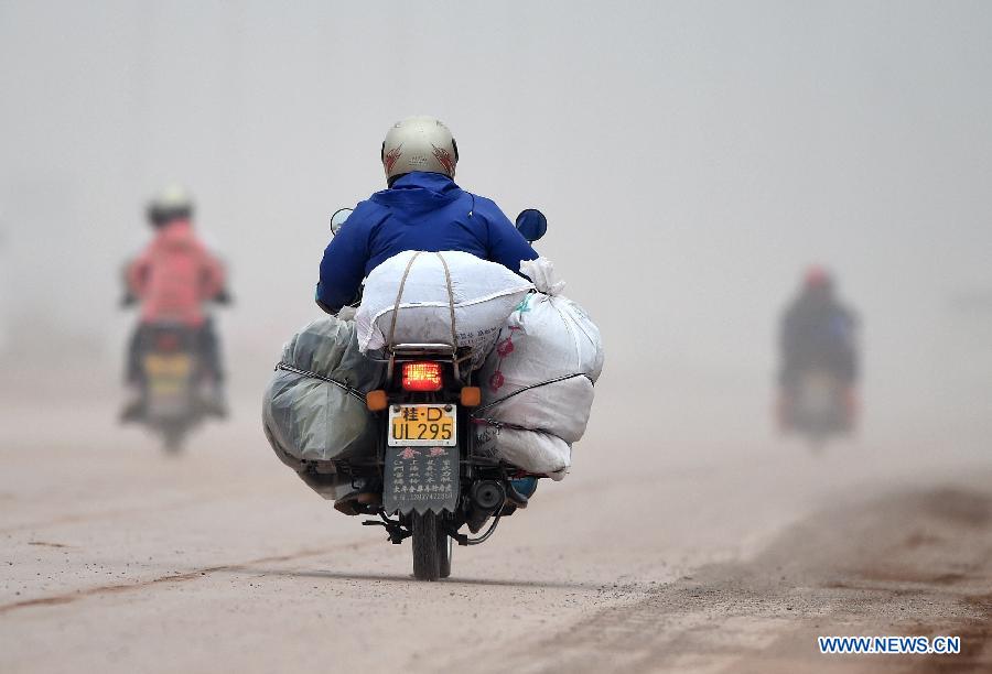 | Photo taken on Feb. 5, 2015 shows a man returning home by motorcycle on the Wuzhou section of 321 national highway in south China's Guangxi Zhuang Autonomous Region. Many migrant workers in Guangxi chose to ride motorcycles back home for Spring Festival. The 40-day travel frenzy known as "Chunyun", the hectic period surrounding Spring Festival, which falls this year on Feb. 19, began on Feb. 4 and will last until March 16. (Xinhua/Huang Xiaobang) |
