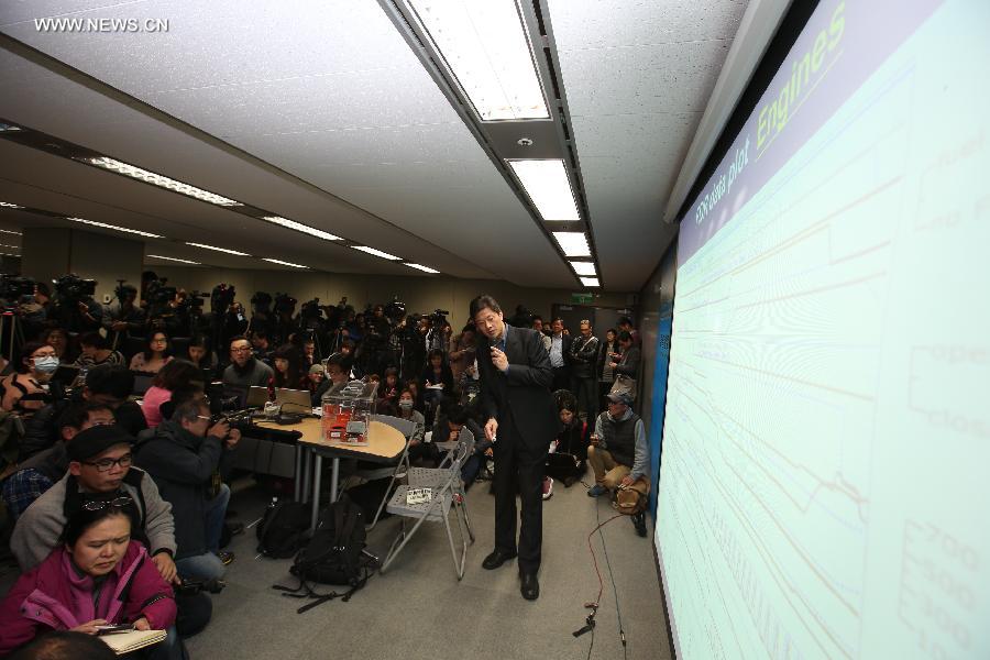 Aviation Safety Council Executive Director Thomas Wang briefs on the investigation of TransAsia Airways Flight GE235 occurrence at a press conference in New Taipei City of southeast China's Taiwan, Feb. 6, 2015. Authorities analyzed the plane's two flight data recorders, or "black boxes", and voice recordings recovered from the plane after it crashed into the Keelung River after takeoff from Songshan Airport at 10:52 a.m on Feb. 4. A preliminary report on the accident will be released within 30 days. (Xinhua/Jin Liwang)