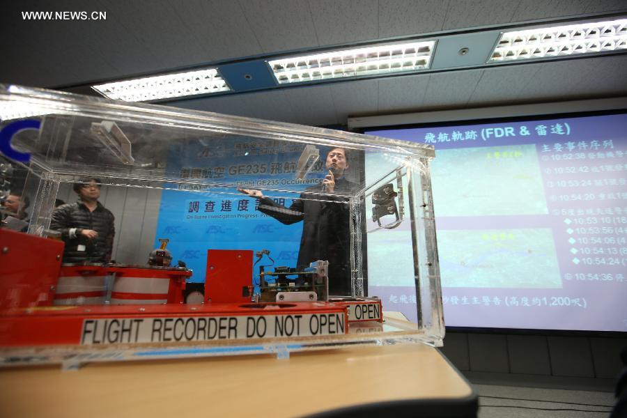 Aviation Safety Council Executive Director Thomas Wang briefs on the investigation of TransAsia Airways Flight GE235 occurrence at a press conference in New Taipei City of southeast China's Taiwan, Feb. 6, 2015. Authorities analyzed the plane's two flight data recorders, or "black boxes", and voice recordings recovered from the plane after it crashed into the Keelung River after takeoff from Songshan Airport at 10:52 a.m on Feb. 4. A preliminary report on the accident will be released within 30 days. (Xinhua/Jin Liwang)
