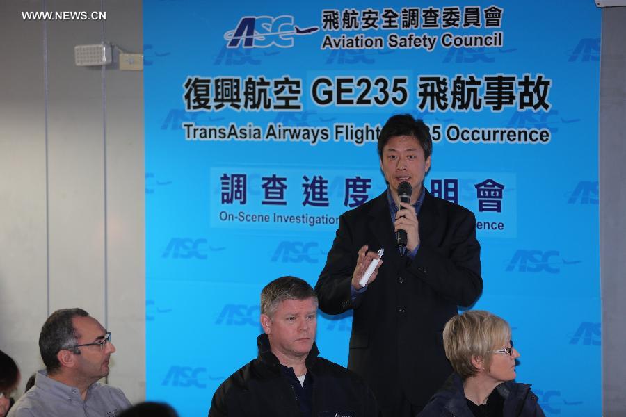 Aviation Safety Council Executive Director Thomas Wang briefs on the investigation of TransAsia Airways Flight GE235 occurrence at a press conference in New Taipei City of southeast China's Taiwan, Feb. 6, 2015. Authorities analyzed the plane's two flight data recorders, or "black boxes", and voice recordings recovered from the plane after it crashed into the Keelung River after takeoff from Songshan Airport at 10:52 a.m on Feb. 4. A preliminary report on the accident will be released within 30 days. (Xinhua/Jin Liwang)