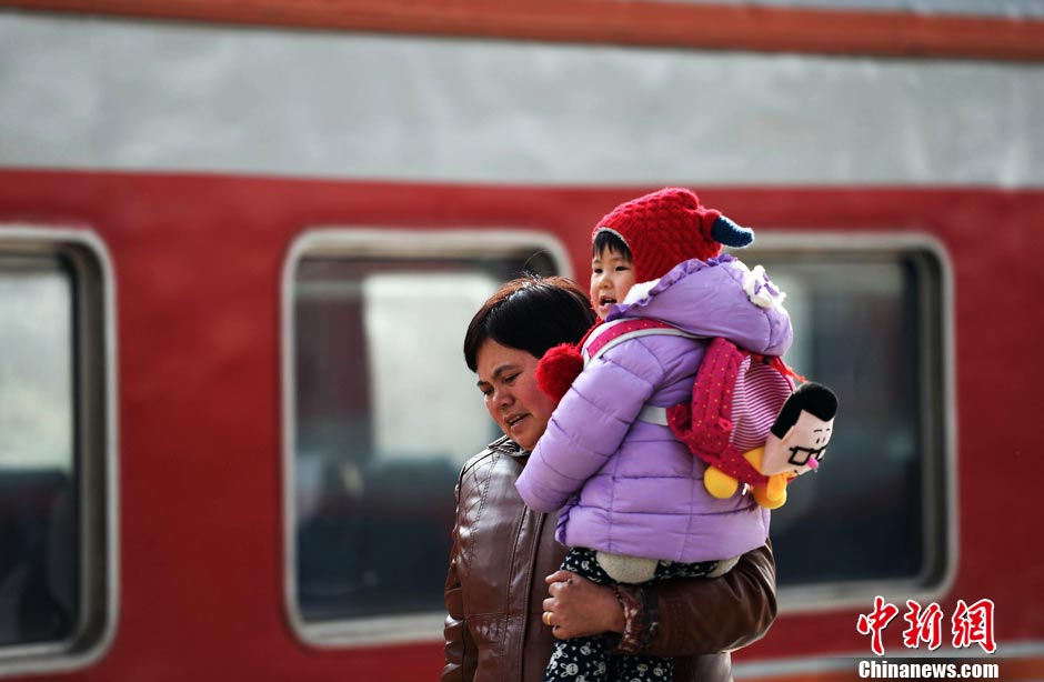 A woman gets on a train with her child at Bozhou Railway Station, east China's Anhui province, Feb. 2, 2015. To avoid the Spring Festival travel rush, many parents choose to go back home early. (CNS/Liu Qinli)