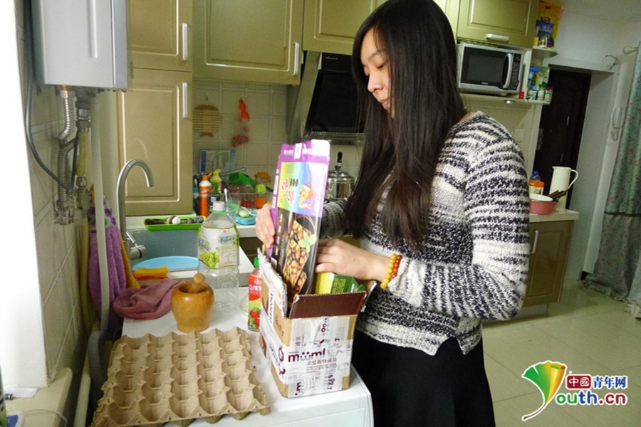Xiao Ji collects the discarded cartons. Online shopping is popular in modern society. As a result, large number of cartons are produced and wasted. Xiao Ji hopes her minor efforts could make contribution to improvement of environment. (Youth.cn/Gao Lei)