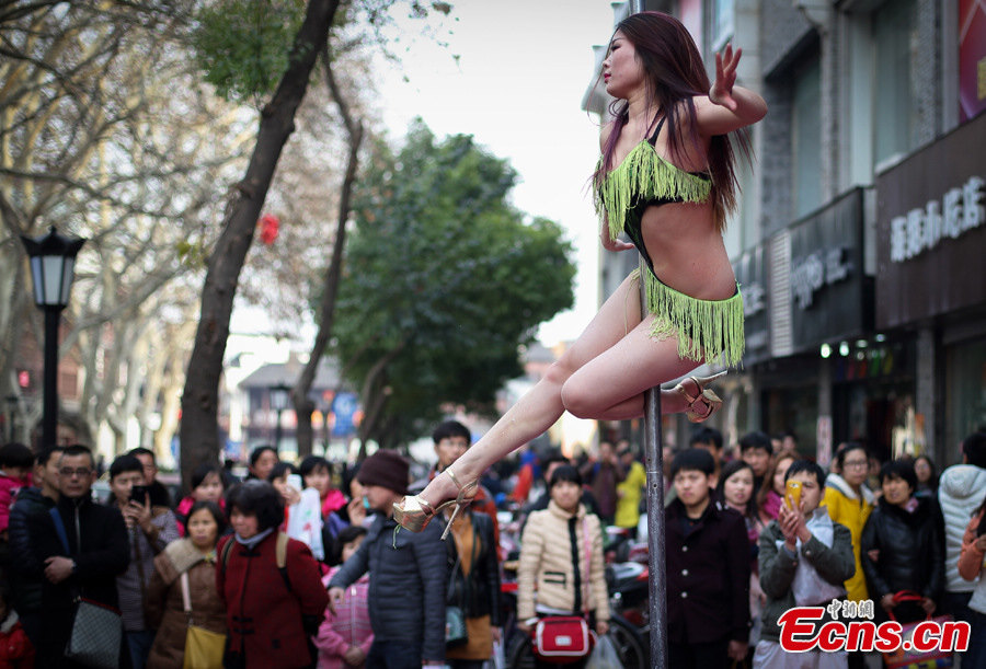 | A pole dancer performs outdoors to attract customers in Nanjing, Feb 7, 2015. (Photo: China News Service/Yang Bo) |