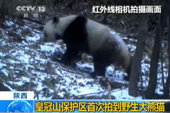| The still from a China Central Television (CCTV) news program shows the wild giant panda observed by a camera in the Huangguan Mountain Reserve on December 11, 2014. (Photo/CCTV News) |