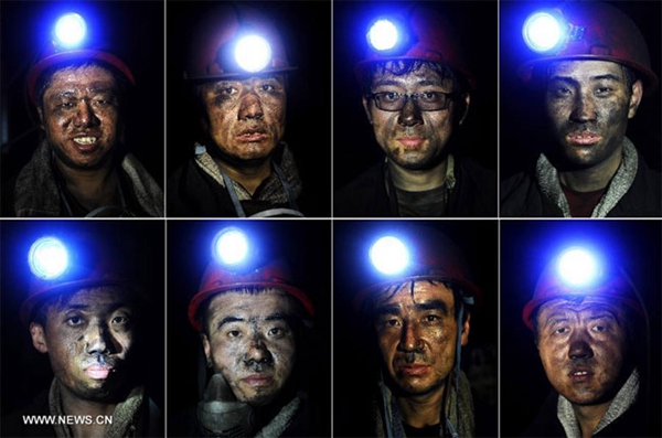 | Combo photo taken on April 22, 2014 shows the portraits of miners in a coal mine in north China's Shanxi province. [Photo: Xinhua] |