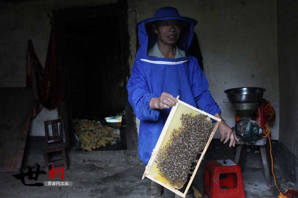 Li, 62, holds a brood frame.(cnwest.com/Wei Yongxian)