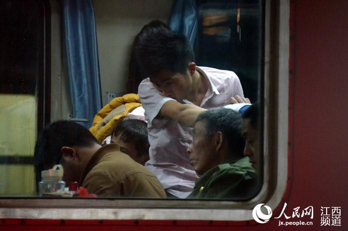With the approaching of China's lunar new year, or the Spring Festival, more and more people have embarked on their journey to return home in Chunyun or the Spring Festival travel rush, the world's biggest travel rush. On the late night of Feb. 7, People's Daily Online reporters shot the expression of passengers in the carriages at the Nanchang station, which is the only provincial hub station along the Beijing-Kowloon Railway. Most of them looked tired but were happy because they would reunite with their families after one night travel. (People.com.cn/Photo)