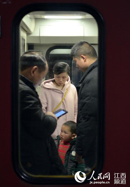 | With the approaching of China's lunar new year, or the Spring Festival, more and more people have embarked on their journey to return home in Chunyun or the Spring Festival travel rush, the world's biggest travel rush. On the late night of Feb. 7, People's Daily Online reporters shot the expression of passengers in the carriages at the Nanchang station, which is the only provincial hub station along the Beijing-Kowloon Railway. Most of them looked tired but were happy because they would reunite with their families after one night travel. (People.com.cn/Photo) |