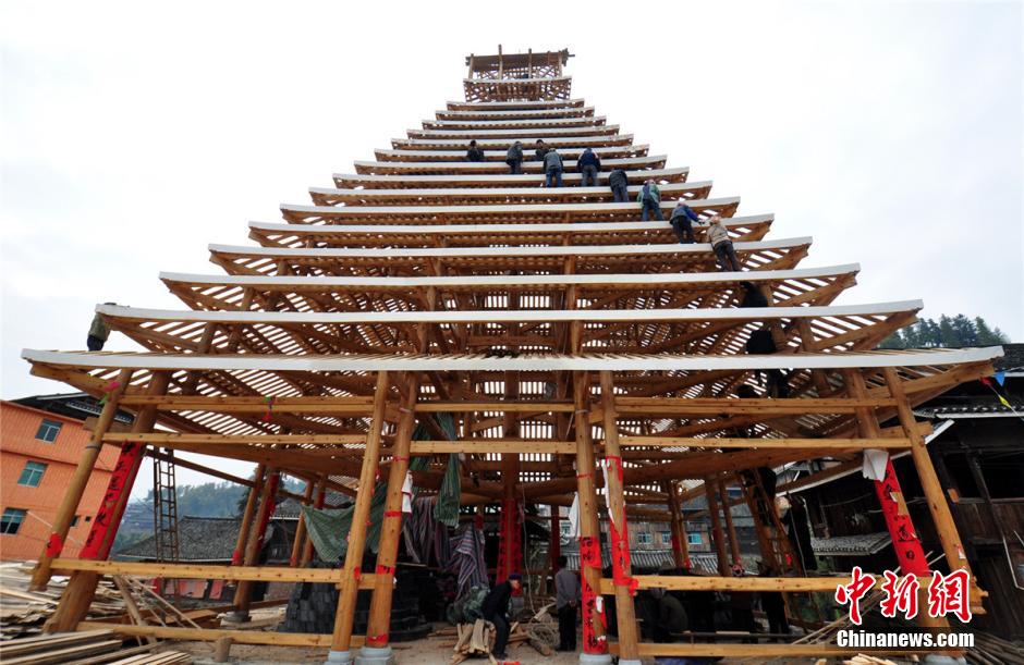 Dong people (a minority of China) build a drum tower to welcome the Chinese New Year in Pingyan village of Sanjiang county, south China’s Guangxi Zhuang autonomous region on Feb. 7, 2015. The drum tower is regarded as the soul of a Dong village and the construction is funded by all the villagers. (Chinanews/Gong Pukang)