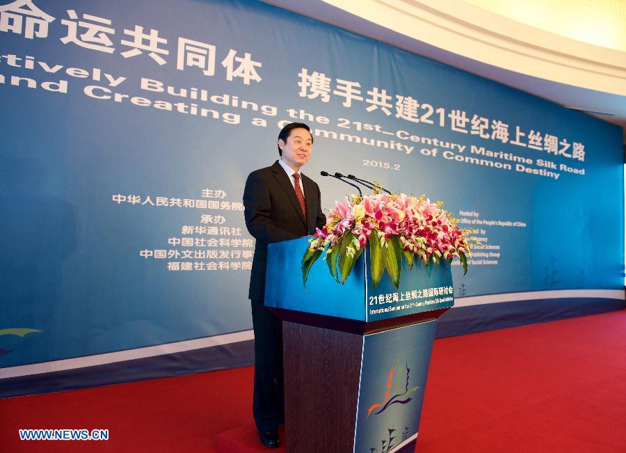 Liu Qibao, a member of the Political Bureau of the Communist Party of China (CPC) Central Committee and the Secretariat of the CPC Central Committee, who is also head of the CPC Central Committee's Publicity Department, delivers a keynote speech at the international seminar on the 21st Century Maritime Silk Road held in Quanzhou, southeast China's Fujian Province, Feb. 12, 2015. (Xinhua/Jiang Kehong)