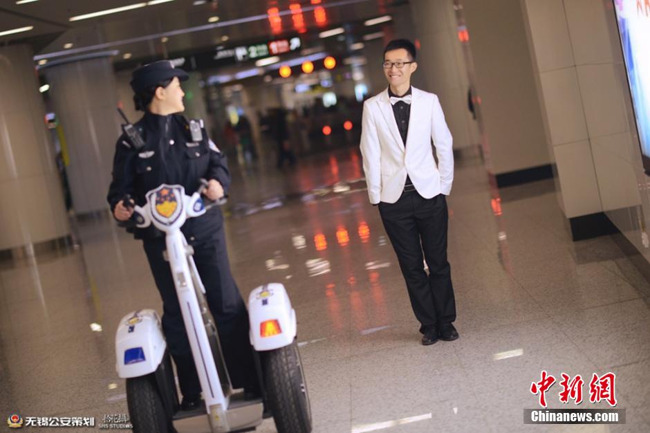 The Public Security Bureau of Wuxi city posts a series of cool wedding photos of policemen on its official Weibo account on Feb. 10, 2015. 11 policemen from different units took their wedding photos in uniforms. (Photo provided by Wuxi police department)