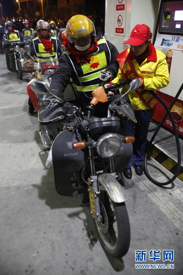 Motorbike riders line up to get free gas in a gas station in Quanzhou, southeast China’s Fujian province on Feb. 9, 2015. (Xinhua/Wang Shen)