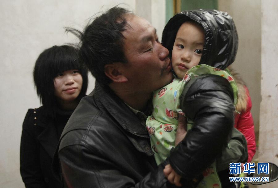 Zhong Fulinsheng (second from left) kisses his 2-year-old grandson as soon as he enters the door in Ruijin, east China’s Jiangxi province on Feb. 9, 2015. (Xinhua/Wang Shen)
