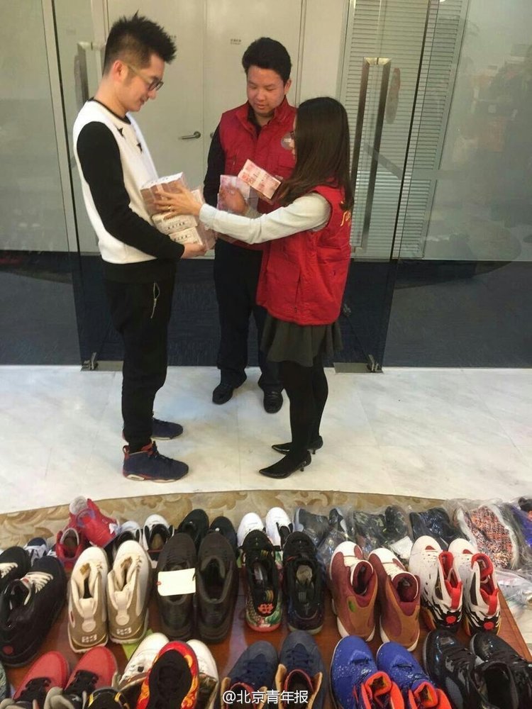 Mick (nickname), a Beijing man born in 1985, pawned his 283 pairs of Nike Jordan shoes that he had collected for over 10 years, in exchange of 1 million yuan ( 160,000 US dollars) to pay the down payment of an apartment in Beijing. Mick said the he needed the money to buy the apartment for his marriage, and he would redeem the shoes back in two months.