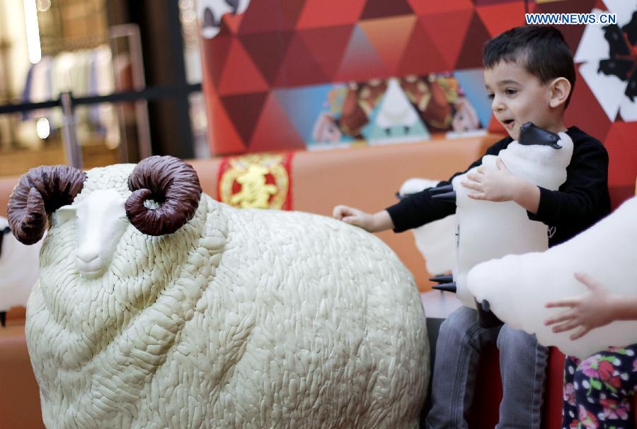 A kid is attracted by the sheep lanterns displayed at a shopping mall in Vancouver, Canada, Feb. 12, 2015. About 180 sheep lanterns are installed at a shopping mall in Vancouver to celebrate the upcoming lunar year of the Sheep. (Xinhua/Liang Sen)