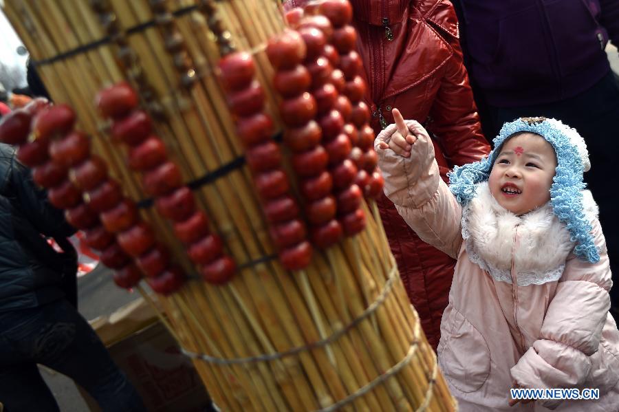 A child watches sugarcoated haws on a stick at a market in Shenyang, capital of northeast China's Liaoning Province, Feb. 15, 2015. Local residents are busy with purchasing goods for the coming Spring Festival, which falls on Feb. 19 this year. (Xinhua/Pan Yulong)