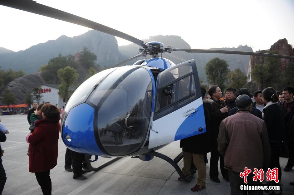 Central China's Hunan province launched its first helicopter sightseeing service in Shiniuzhai scenic spot, Pingjiang county on Feb. 12, 2015. The new service attracted many villagers, tourists and will promote the popularization of helicopter tour.