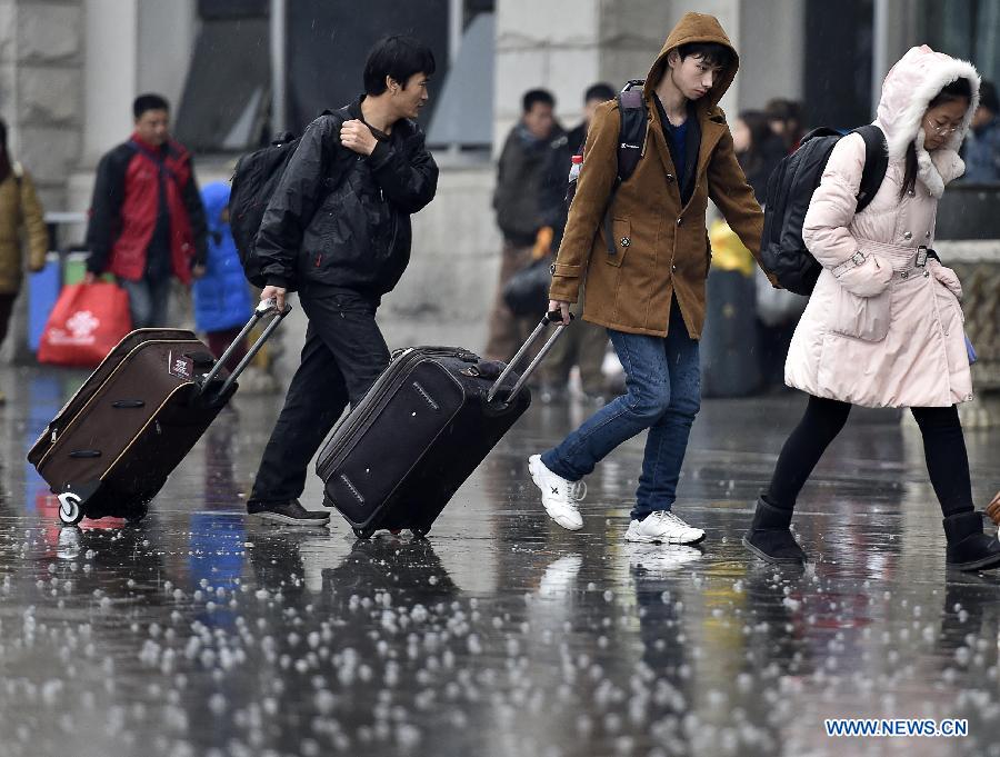 Passengers pull luggages in the rain at Tianjin railway station in Tianjin, north China, Feb. 15, 2015. A rainfall hit the city Sunday. (Xinhua/Yue Yuewei)