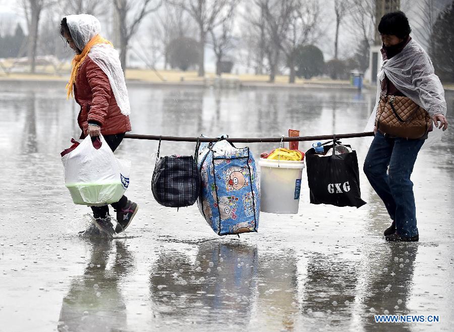 Two passengers carry their luggages with a stick in the rain at Tianjin railway station in Tianjin, north China, Feb. 15, 2015. A rainfall hit the city Sunday. (Xinhua/Yue Yuewei)