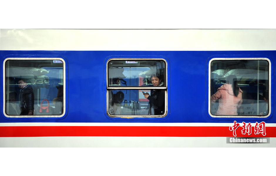 Photo shows the chunyun as seen through train windows in Beijing West Railway Station, Feb. 11, 2015.The Spring Festival travel rush, known as "chunyun", will enter its peak period. (CNS/Jin Shuo)