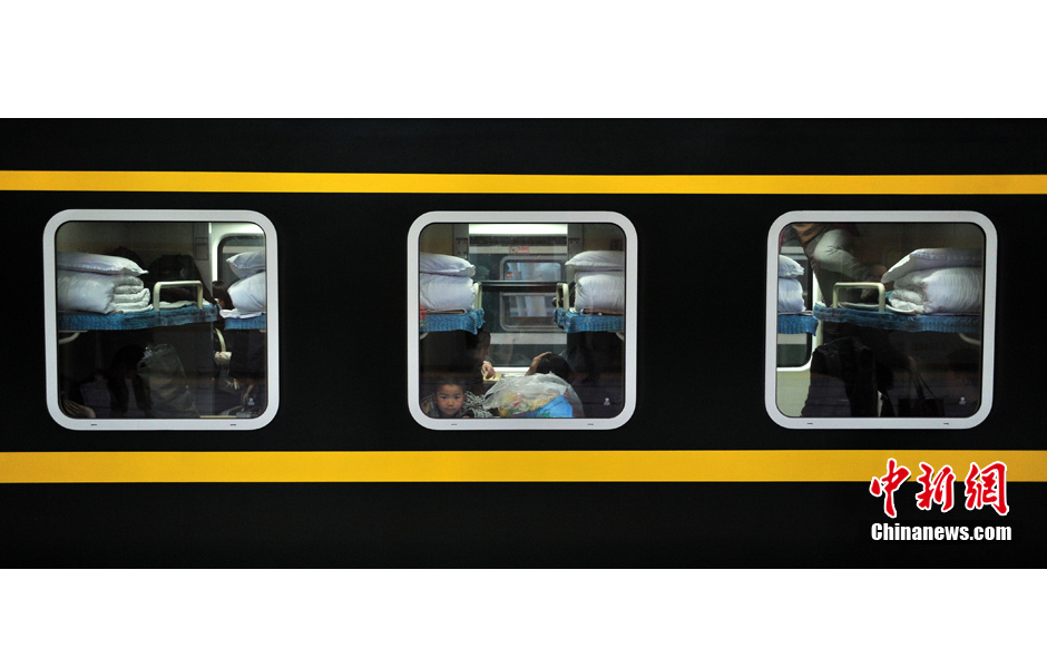 Photo shows the chunyun as seen through train windows in Beijing West Railway Station, Feb. 11, 2015.The Spring Festival travel rush, known as "chunyun", will enter its peak period. (CNS/Jin Shuo)