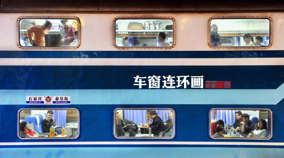 Photo shows the chunyun as seen through train windows in Beijing West Railway Station, Feb. 11, 2015.The Spring Festival travel rush, known as "chunyun", will enter its peak period. (CNS/Jin Shuo)