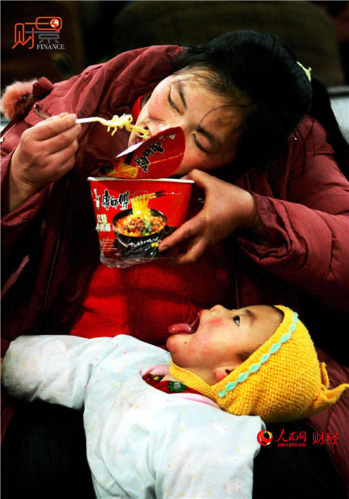 On Jan. 18, 2006, a mother feeds her baby in Beijing West Railway Station. (Photo/People.cn)