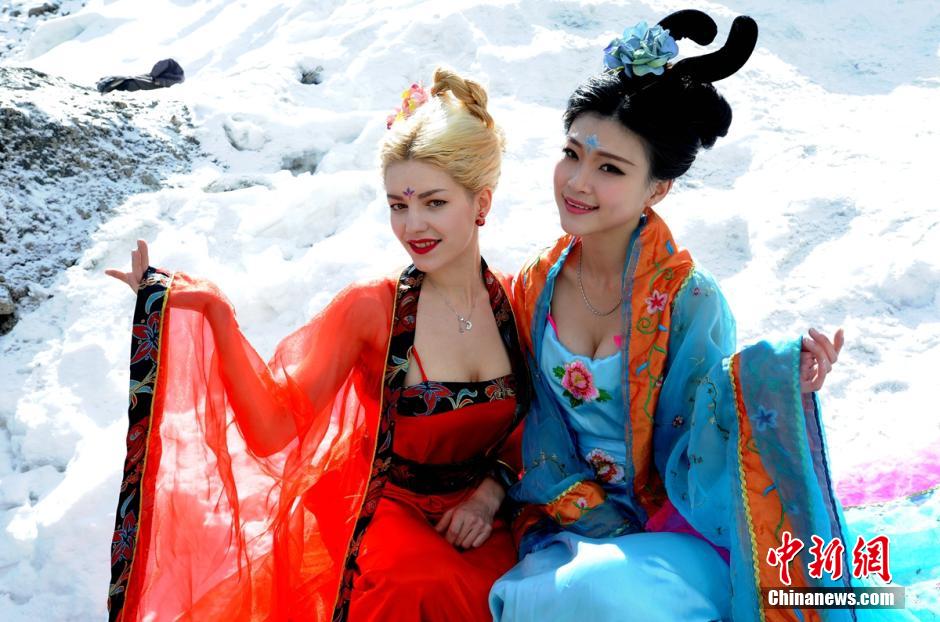 Located in southwest China’s Sichuan province, Hailuogou Valley is the lowest glacier zone in the world, and is a famous natural park in China. From Feb. 14 to Feb. 15, 2015, a group of “ancient beauties” played by models appeared at Hailuogou to attract tourists. Some models were dressed as the “God of Wealth” and handed out red envelopes to tourists. (Chinanews/Liu Zhongjun)