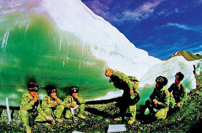 Take a picnic by the icy lake, 5,380 meters above the sea level, at Shenxianwan, northwest China’s Xinjiang Uygur Autonomous Region.(Chinese Ministry of Defense/Zhou Chaorong)