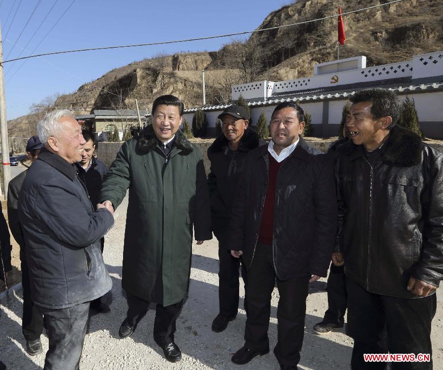 | Chinese President and General Secretary of the Communist Party of China Central Committee Xi Jinping (2nd L front), also chairman of the Central Military Commission, talks with locals while visiting Liangjiahe Village, Wen'anyi Township of Yanchuan County, Yan'an, northwest China's Shaanxi Province, Feb. 13, 2015. Xi made a tour in Shaanxi on Feb. 13 - 16, and extended festival greetings to locals and people across the nation ahead of the Spring Festival, which falls on Feb. 19. (Xinhua/Lan Hongguang) |
