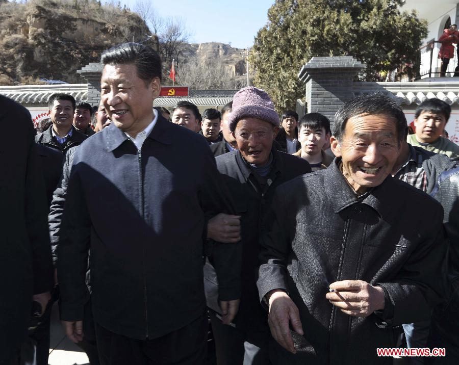 Chinese President and General Secretary of the Communist Party of China Central Committee Xi Jinping (L front), also chairman of the Central Military Commission, walks with locals while visiting Liangjiahe Village, Wen'anyi Township of Yanchuan County, Yan'an, northwest China's Shaanxi Province, Feb. 13, 2015. Xi made a tour in Shaanxi on Feb. 13 - 16, and extended festival greetings to locals and people across the nation ahead of the Spring Festival, which falls on Feb. 19. (Xinhua/Lan Hongguang)