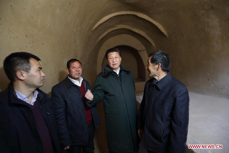 Chinese President and General Secretary of the Communist Party of China Central Committee Xi Jinping (2nd R), also chairman of the Central Military Commission, recalls his life in Liangjiahe Village while visiting the people in the village, in Wen'anyi Township of Yanchuan County, Yan'an, northwest China's Shaanxi Province, Feb. 13, 2015. Xi made a tour in Shaanxi on Feb. 13 - 16, and extended festival greetings to locals and people across the nation ahead of the Spring Festival, which falls on Feb. 19. (Xinhua/Lan Hongguang)