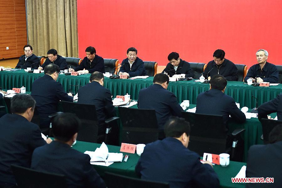 Chinese President and General Secretary of the Communist Party of China Central Committee Xi Jinping (4th L rear), also chairman of the Central Military Commission, presides over a seminar on shaking off poverty and becoming prosperous at China Executive Leadership Academy, Yan'an, northwest China's Shaanxi Province, Feb. 13, 2015. Xi made a tour in Shaanxi on Feb. 13 - 16, and extended festival greetings to locals and people across the nation ahead of the Spring Festival, which falls on Feb. 19. (Xinhua/Li Tao)