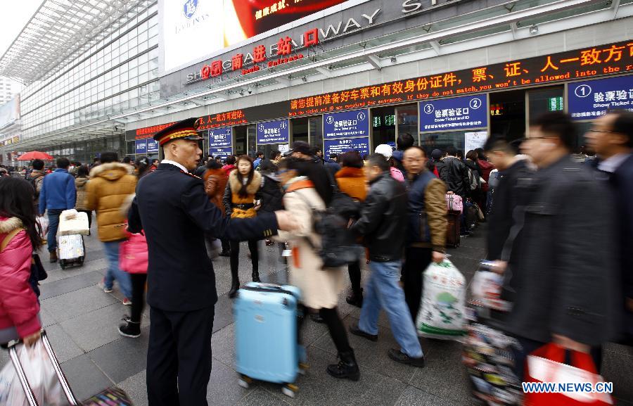 A staff member directs passengers to enter the Shanghai Railway Station in Shanghai, east China, Feb. 16, 2015. A travel rush came to its peak as passengers were hurry for home reunion during the Spring Festival or Chinese Lunar New Year, which falls on Feb. 19 this year. (Xinhua/Fang Zhe)