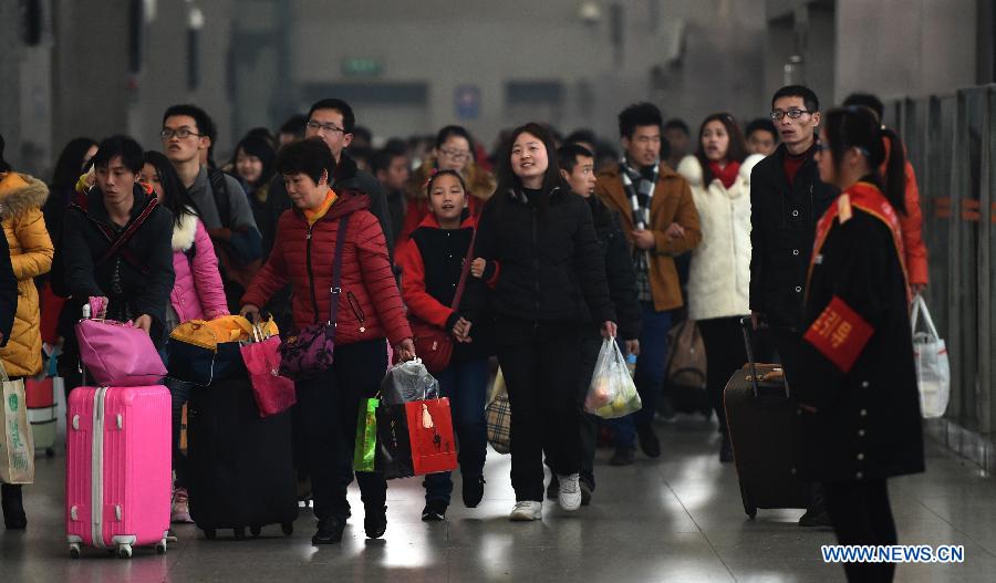 Passengers prepare to get on trains at Wuchang Railway Station in Wuhan, capital of central China's Hubei Province, Feb. 16, 2015. A travel rush came to its peak as passengers were hurry for home reunion during the Spring Festival or Chinese Lunar New Year, which falls on Feb. 19 this year. (Xinhua/Cheng Min)