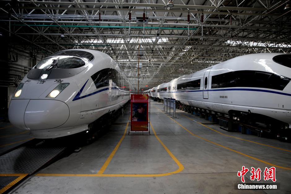 | Photo shows the birth of high-speed trains at workshops in CNR Tangshan Railway Vehicle Co., Ltd. During the Spring Festival travel rush, known as "chunyun", the high-speed rail plays an irreplaceable role with its high-speed, stability and high-density. In 2014, the CNR export turnover reached 3 billion US dollars, an increase of 68.6 percent compared with the previous year. (CNS/Yang Kejia) |