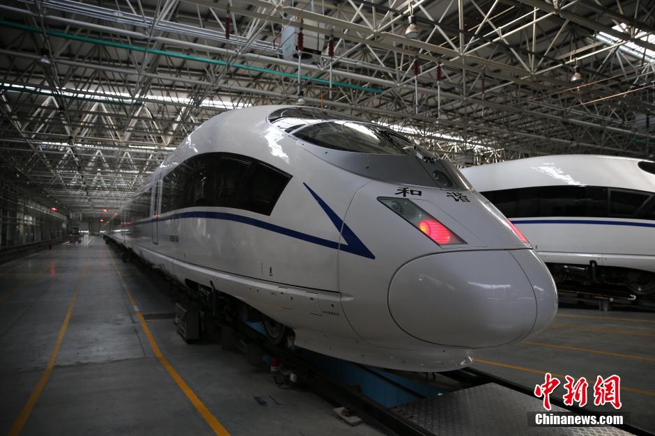Photo shows the birth of high-speed trains at workshops in CNR Tangshan Railway Vehicle Co., Ltd. During the Spring Festival travel rush, known as "chunyun", the high-speed rail plays an irreplaceable role with its high-speed, stability and high-density. In 2014, the CNR export turnover reached 3 billion US dollars, an increase of 68.6 percent compared with the previous year. (CNS/Yang Kejia)