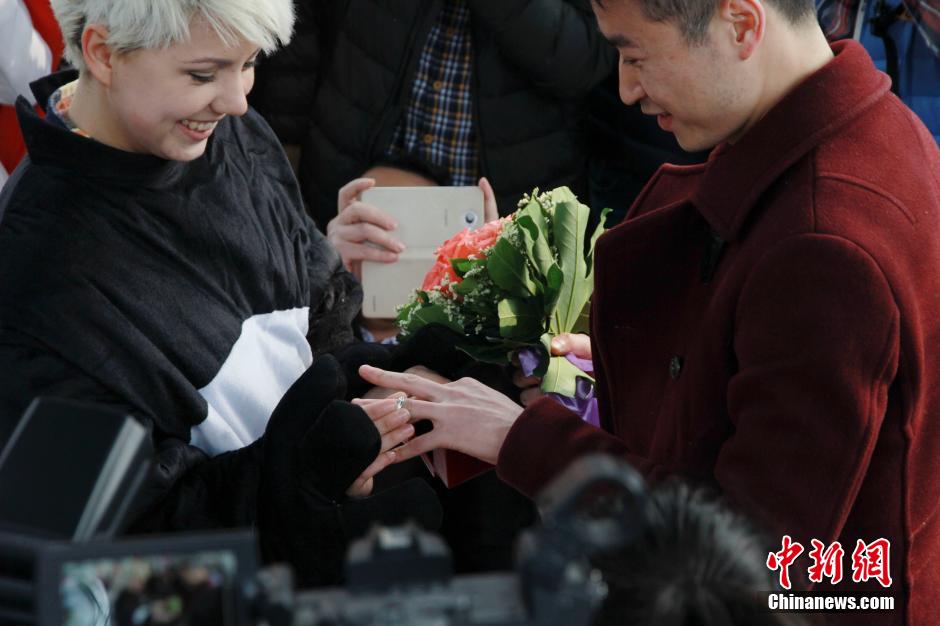 26-year-old Ukraine girl Sasha, dressing in a panda suit, proposes to his Chinese boyfriend on the Valentine's Day in the street of Dujiangyan in southwest China's Sichuan province. One year ago, she came to travel in China and fell in love with her Chinese boyfriend. (Photo/CNS)