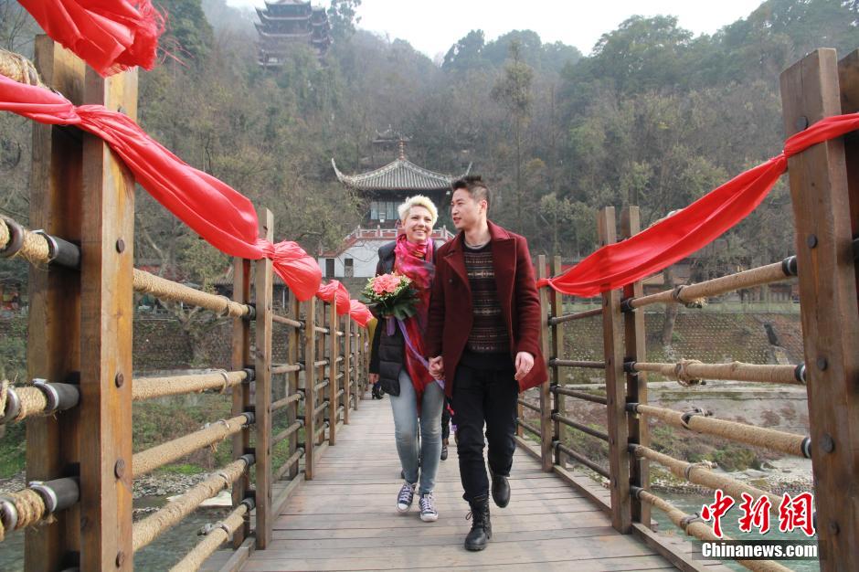26-year-old Ukraine girl Sasha, dressing in a panda suit, proposes to his Chinese boyfriend on the Valentine's Day in the street of Dujiangyan in southwest China's Sichuan province. One year ago, she came to travel in China and fell in love with her Chinese boyfriend. (Photo/CNS)
