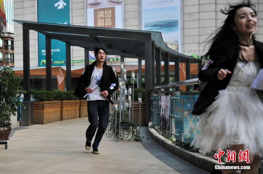 A high-heels running race is held on the Valentine's Day in a shopping mall in Kunming, capital of southwest China's Yunnan province. (CNS/Ren Dong)