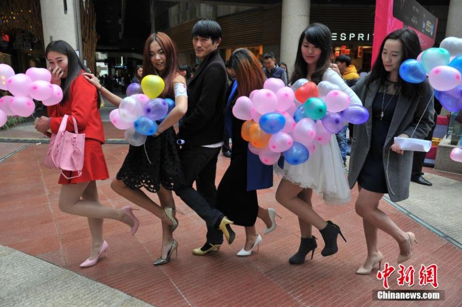 A high-heels running race is held on the Valentine's Day in a shopping mall in Kunming, capital of southwest China's Yunnan province. (CNS/Ren Dong)