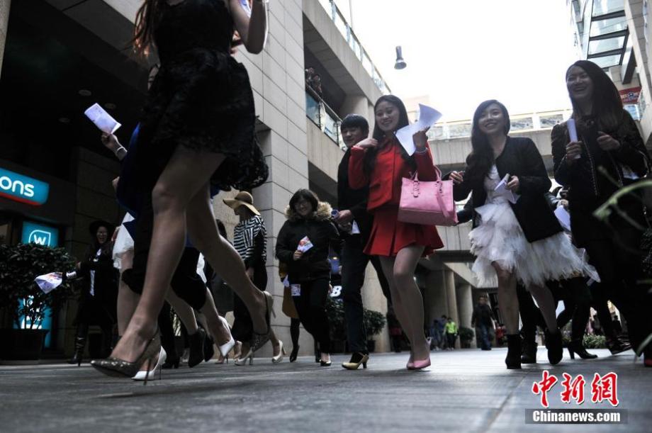 A high-heels running race is held on the Valentine's Day in a shopping mall in Kunming, capital of southwest China's Yunnan province. (CNS/Ren Dong)