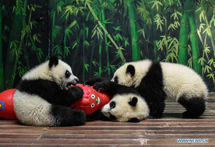 Five-month-old giant panda triplets play with toy sheep offered by their breeders at Chime Long Safari Park in Guangzhou, south China's Guangdong Province, Feb. 18, 2015, on the eve of Chinese lunar new year of sheep. (Xinhua/Liu Dawei)