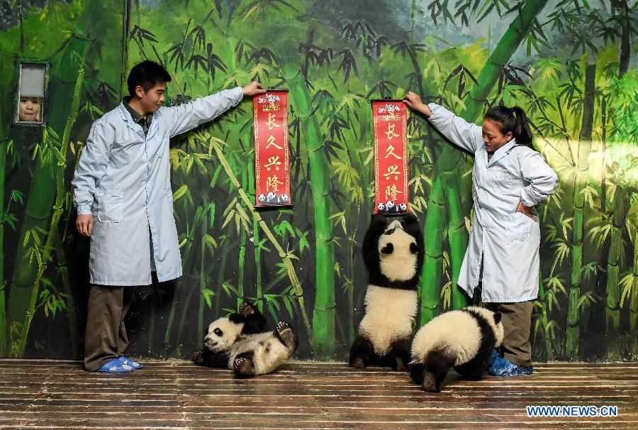 | Five-month-old giant panda triplets play as their breeders hang Spring Festival scrolls on the enclosure's wall at Chime Long Safari Park in Guangzhou, south China's Guangdong Province, Feb. 18, 2015, on the eve of Chinese lunar new year. (Xinhua/Liu Dawei) |