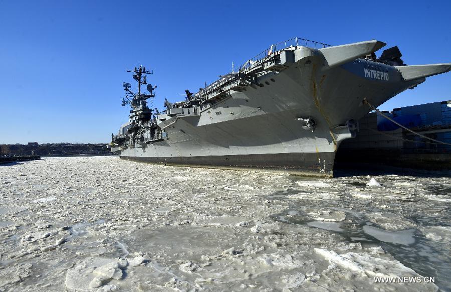 Ice floes are viewed by the Intrepid Sea, Air & Space Museumn in New York City, the United States, on Feb. 20, 2015. New York City Emergency Management has issued a weather alert for dangerous cold temperatures for Feb. 20, followed by a wintry mix of snow, sleet and freezing rain. A bitterly cold chill known as the "Siberian Express" has enveloped much of eastern America, sending temperatures plummeting below their normal February levels to record lows in at least 100 places. (Xinhua/Wang Lei)
