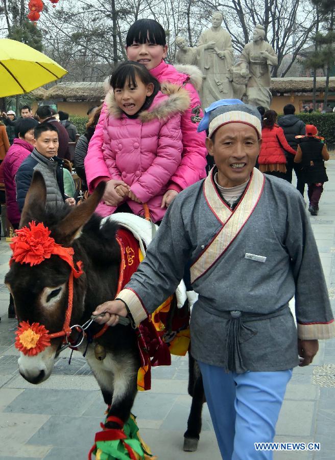 Two tourists ride a donkey to tour a temple fair in Kaifeng, central China's Henan Province, Feb. 20, 2015, the second day of Chinese Lunar New Year. (Xinhua/Wang Song)