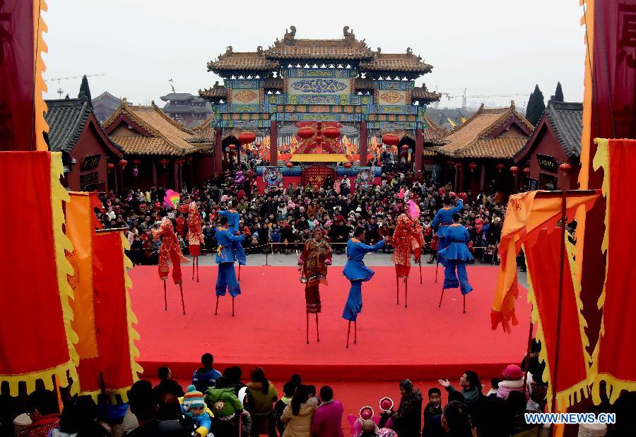 People view a folk performance during a temple fair in Kaifeng, central China's Henan Province, Feb. 20, 2015, the second day of Chinese Lunar New Year. (Xinhua/Wang Song)