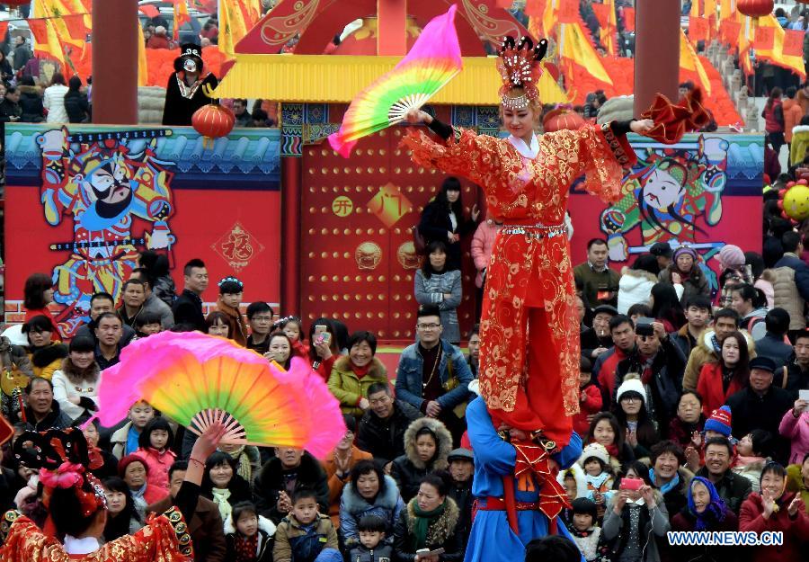 | People view a folk performance during a temple fair in Kaifeng, central China's Henan Province, Feb. 20, 2015, the second day of Chinese Lunar New Year. (Xinhua/Wang Song) |