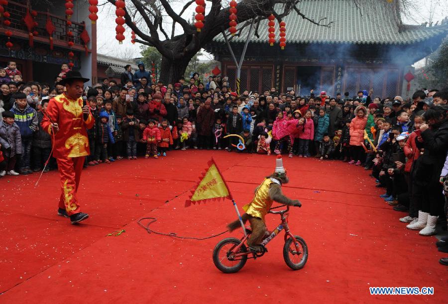 A trainer instructs a monkey to perform during a temple fair in Zhengzhou, capital of central China's Henan Province, Feb. 20, 2015, the second day of Chinese Lunar New Year. (Xinhua/Zhu Xiang)