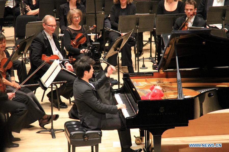 | Chinese pianist Lang Lang performs at the Chinese New Year Concert to celebrate the Chinese traditional Spring Festival at the Roy Thomson Hall in Toronto, Canada, Feb. 21, 2015. It is the second time that the Toronto Symphony Orchestra joined hands with Chinese artists to hold Lunar New Year concert. (Xinhua/Yan Zhonghua) |